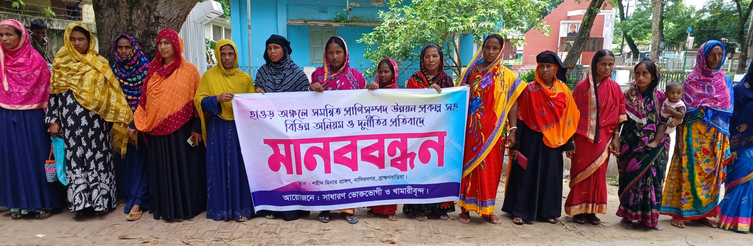 তাঁদের বদলে অন্য কামারীদেরকে দিয়ে দেয় বলে অভিযোগ, ২৩ শে জুলাই রবিবার নাসিরনগরে মানববন্ধন করেছেন নাসিরনগর উপজেলার গোয়ালনগর ও ভলাকুট ইউনিয়নের খামারী বঞ্চিত নারীরা।