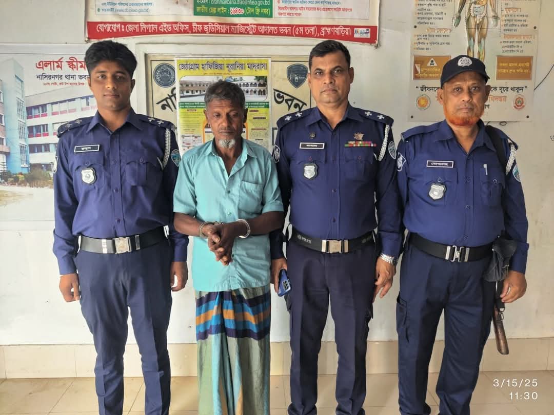 রোজ শুক্রবার ১৪/০৩/২৫ ইং তারিখ মাননীয় পুলিশ সুপার জনাব এহতেশামুল হক মহোদয়ের নির্দেশে, সহকারী পুলিশ সুপার জনাব তপন সরকার মহোদয়ের তত্বাবধানে, অফিসার ইনচার্জ নাসিরনগর থানা জনাব খাইরুল আলম সাহেবের নেতৃত্বে এস.আই কামাল হোসেন, এস.আই সুনীল চন্দ্র, এ.এস.আই সুজন কুমার সাহা সঙ্গীয় ফোর্স সহ দাঁতমন্ডল এলাকায় অভিযান পরিচালনা করে ডাকাত সর্দার ছেলু মিয়া (৪৫), পিতা- মৃত ছিফাত আলী, তার বিরুদ্ধে ৪টি ডাকাতি মামলা, ১টি দস্যুতা মামলা, ৩টি চুরি