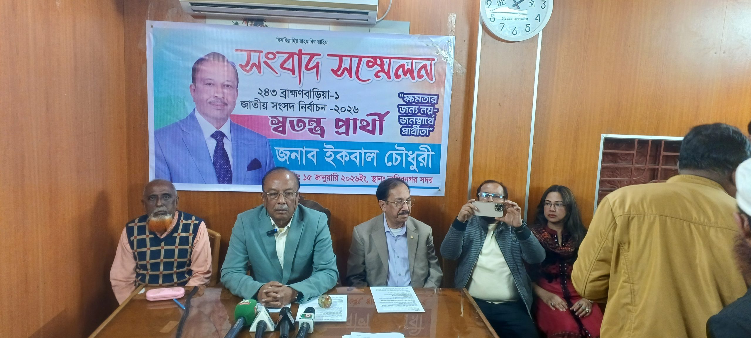 মিহির দেব,ব্রাহ্মণবাড়িয়া ঃ এবার ব্রাহ্মণবাড়িয়া-১ নাসিরনগর আসনে স্বতন্ত্র প্রার্থী হিসাবে মাঠে থাকার ঘোষণা দিয়েছেন নাসিরনগর উপজেলা বিএনপির সাবেক সভাপতি ও বুড়িশ্বর ইউপির চারবারের জনপ্রিয় চেয়ারম্যান ইকবাল চৌধুরী। বৃহস্পতিবার ১ ঘটিকায় ব্যক্তিগত কার্যালয়ে এ সংবাদ সম্মেলনে এ ঘোষণা দেন।